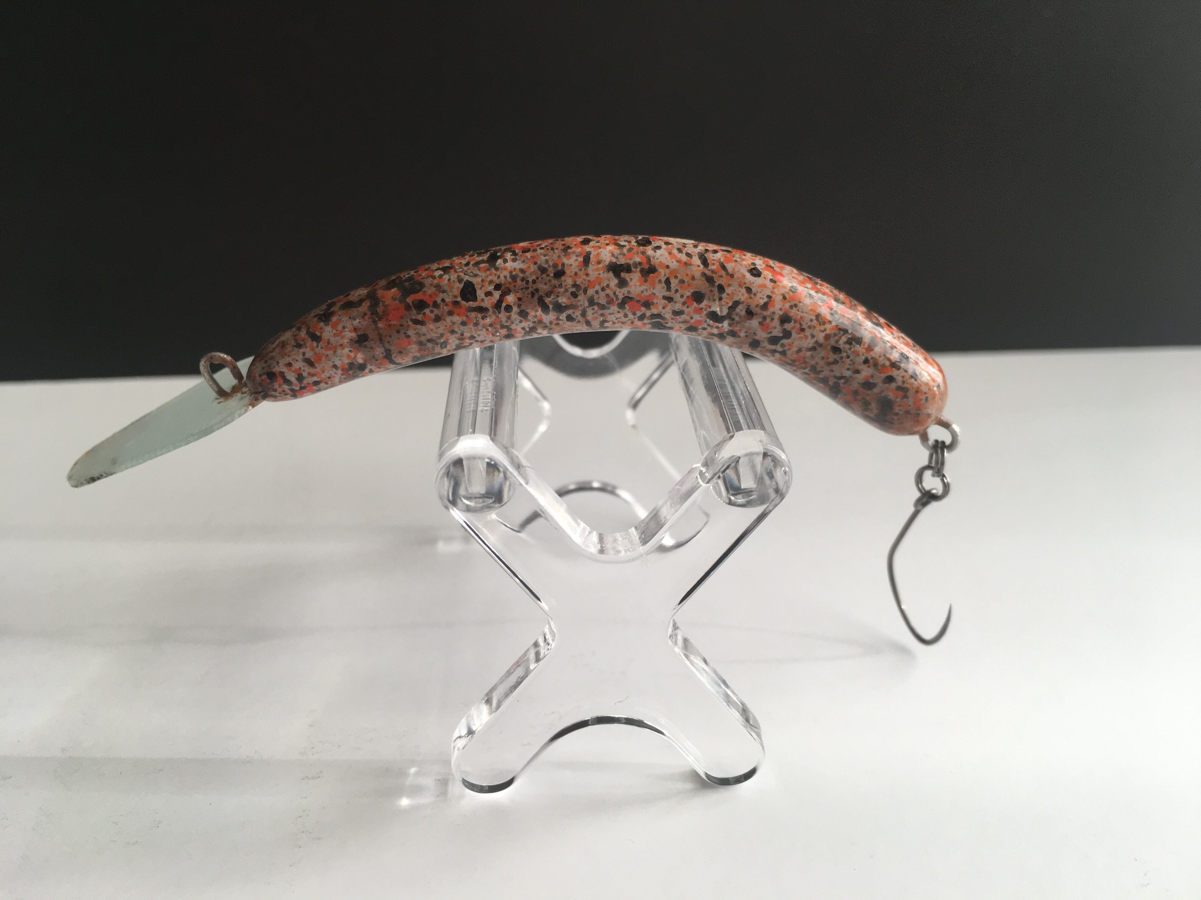 ハンドメイドクランク クレッセントF(フローティング)です。体長7cm・重量4.3g前後になります。カラーはベースに茶色の塗装をしてその上にホワイトのラップ塗装最後にレッド・ブラックの飛ばしで塗装しています。ボディーはエポキシ樹脂を使用していますので多少の曲がりなどが有ったりカラーが飛んでいたりとハンドメイドでの個体差なども有りますのでご了承の上ご購入をお無い致します。また強い刺激を加えると割れの原因にもなりますのでご注意下さい。