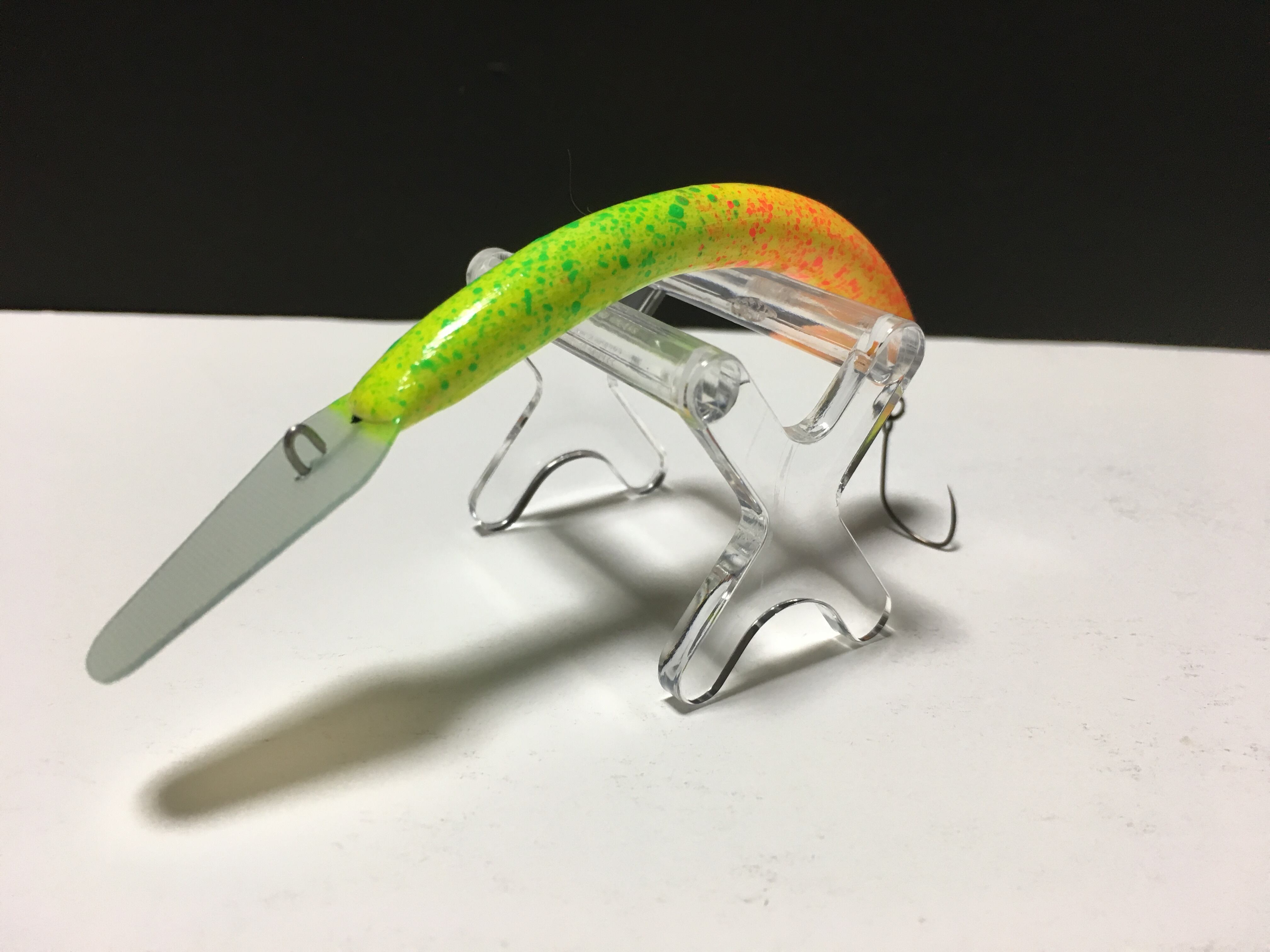 ハンドメイドクランク クレッセントF(フローティング)です。体長8cm・重量4.5g前後になります。カラーはベースに蛍光イエローを使い頭側に蛍光グリーンの飛ばし塗装お尻側に蛍光オレンジの飛ばし塗装をしています。あの〇〇クラのスプラッシュカラーです。ボディーはエポキシ樹脂を使用していますので多少の曲がりなどが有ったりカラーが飛んでいたりとハンドメイドでの個体差なども有りますのでご了承の上ご購入をお無い致します