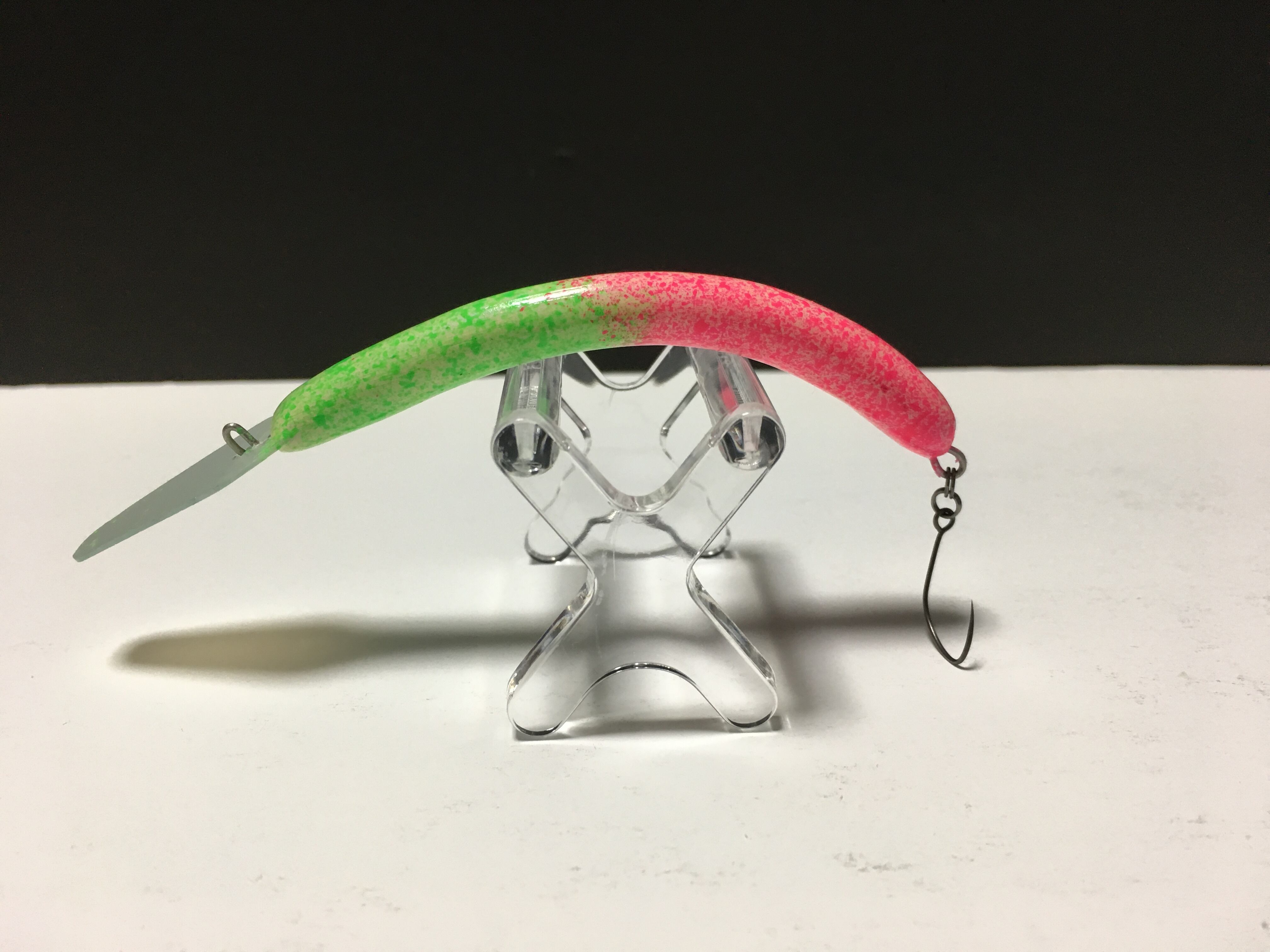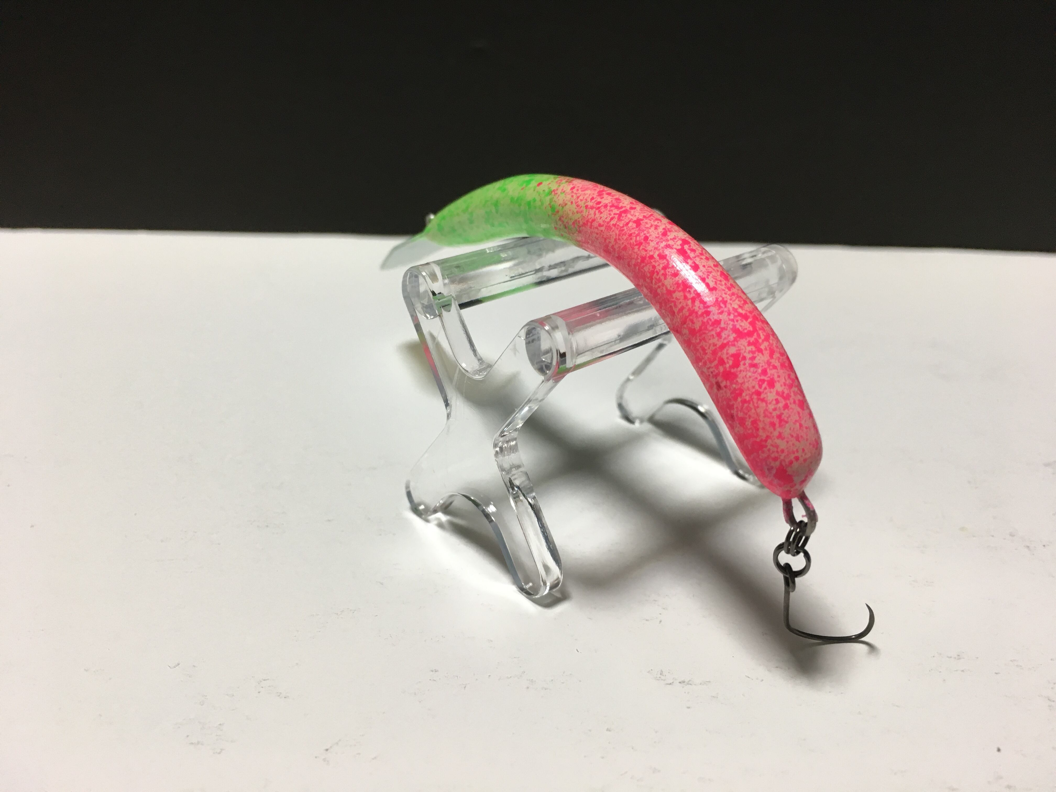 ハンドメイドクランク クレッセントF(フローティング)です。体長8cm・重量4.5g前後になりますカラーはベースにホワイトを使い頭側に蛍光グリーンの飛ばし塗装お尻側に蛍光ピンクの飛ばし塗装をしています。あの〇〇クラのスプラッシュカラーカラーを変えたバージョンです。ボディーはエポキシ樹脂を使用していますので多少の曲がりなどが有ったりカラーが飛んでいたりとハンドメイドでの個体差なども有りますのでご了承の上ご購入をお無い致します