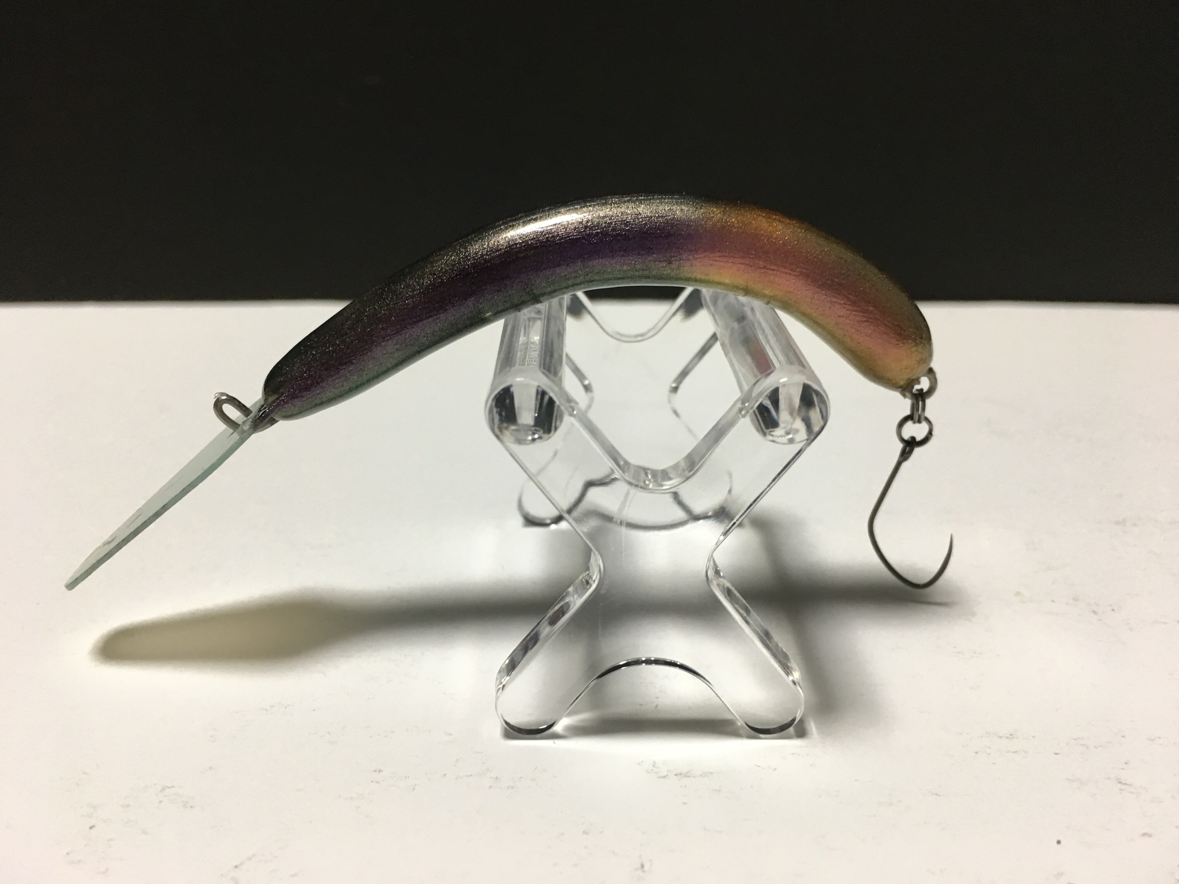 ハンドメイドクランク クレッセントF(フローティング)です。体長7cm・重量4.5g前後になりますカラーはベースにブラックを使って2色のマジョーラ塗料を使って前後で使い分けています。ボディーはエポキシ樹脂を使用していますので多少の曲がりなどが有ったりカラーが飛んでいたりとハンドメイドでの個体差なども有りますのでご了承の上ご購入をお無い致します