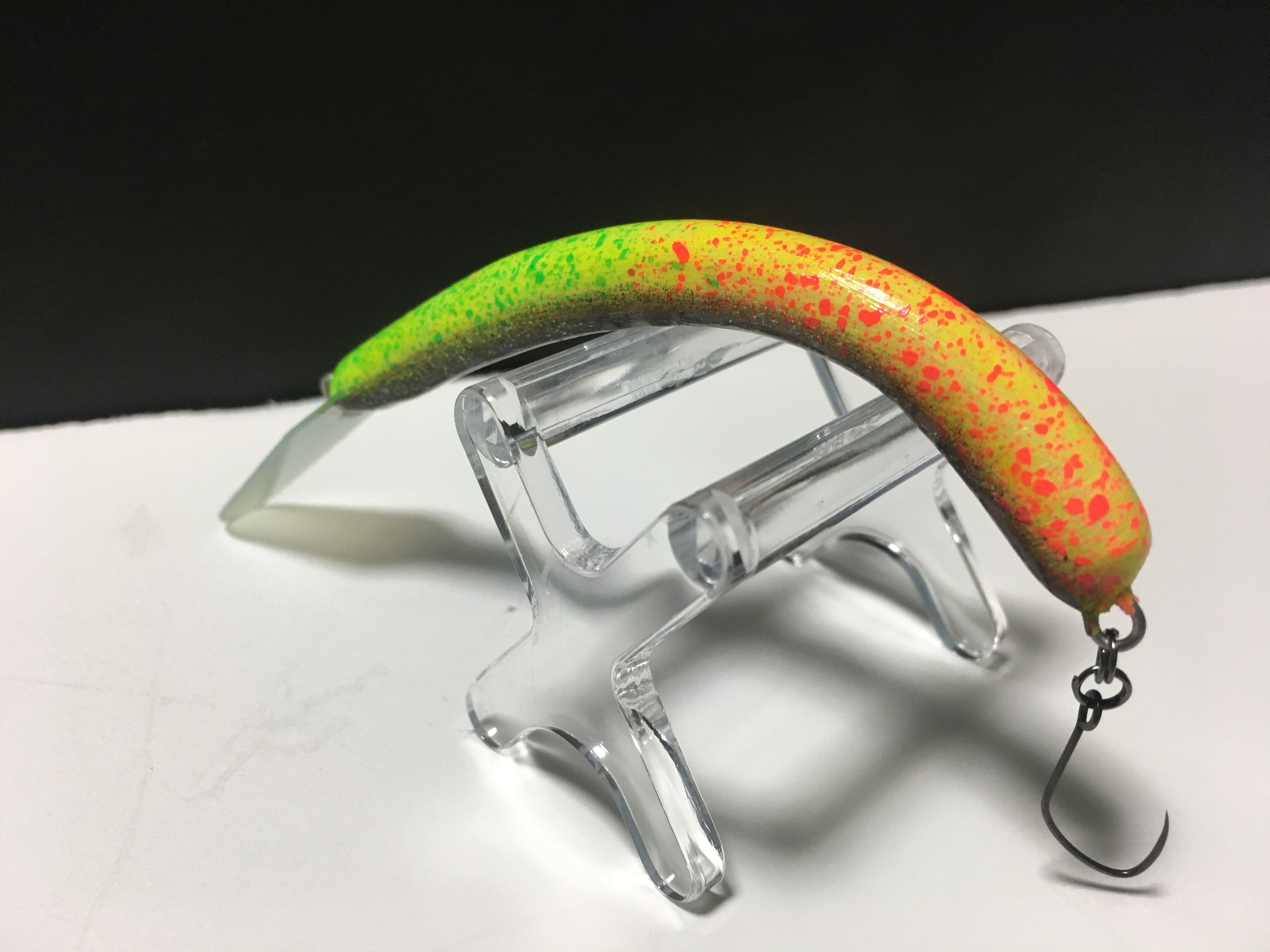 クレッセント8cmスプラッシュのベリーにチョコ風のブラウンカラーを塗装してその上にホロリウムを塗っています。ブラックライトでベリーを照らすとホローの部分がグリーンに蓄光しますので光ます。ルアーの素材にはエポキシパテを使っているので強い衝撃を与えると折れたりヒビの原因になりますのでご注意下さい。