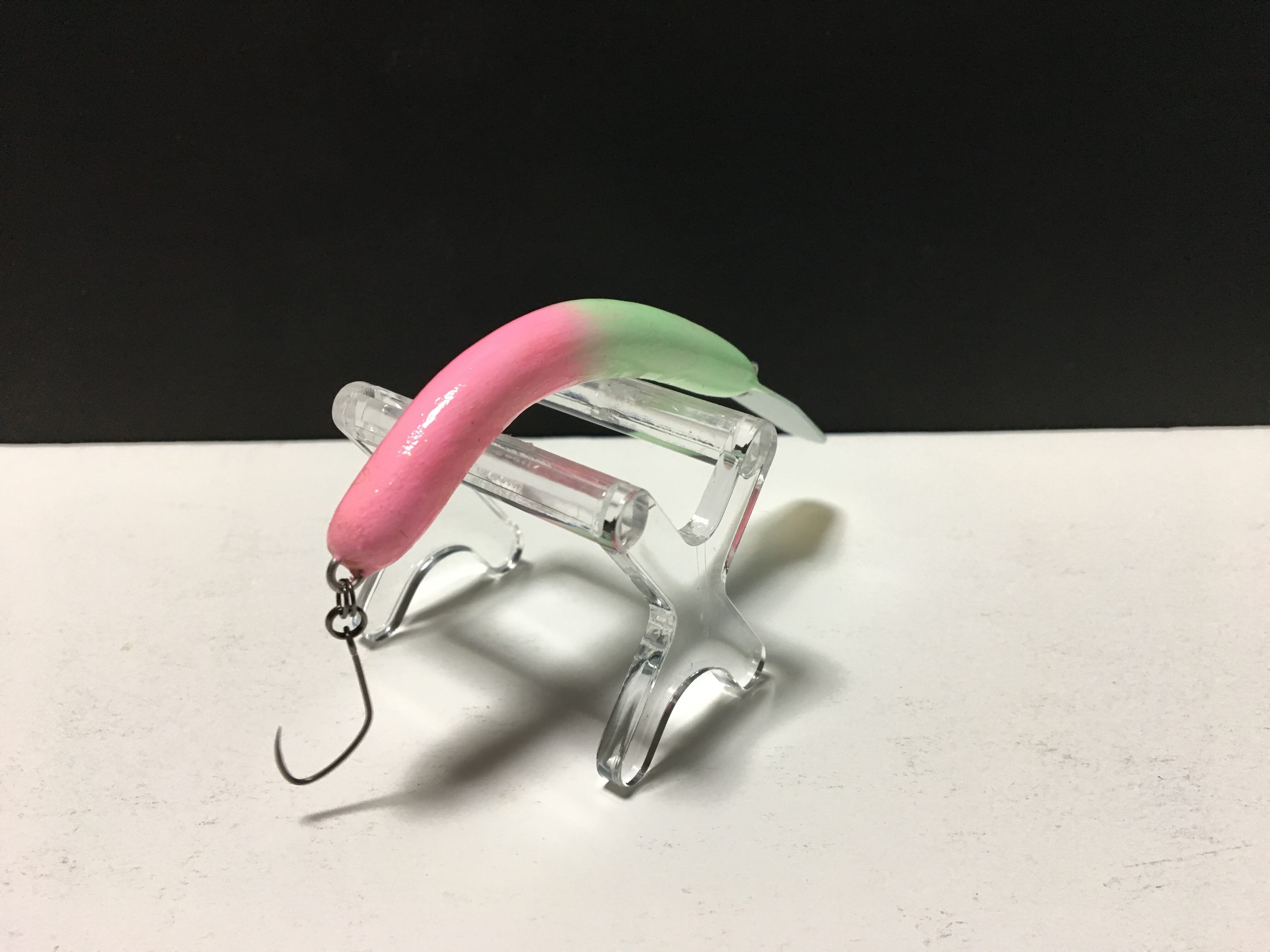 ハンドメイドクランク クレッセントF(フローティング)のハーフグローカラーです。体長7cm・重量4.3g前後になります。カラーはグリーン系とピンク系の2色をベースに使っていてホロリウムグロー仕様となっています。ボディーはエポキシ樹脂を使用していますので多少の曲がりなどが有ったりカラーが飛んでいたりとハンドメイドでの個体差なども有りますのでご了承の上ご購入をお無い致します。また強い刺激を加えると割れの原因なもなりますのでご注意下さい。